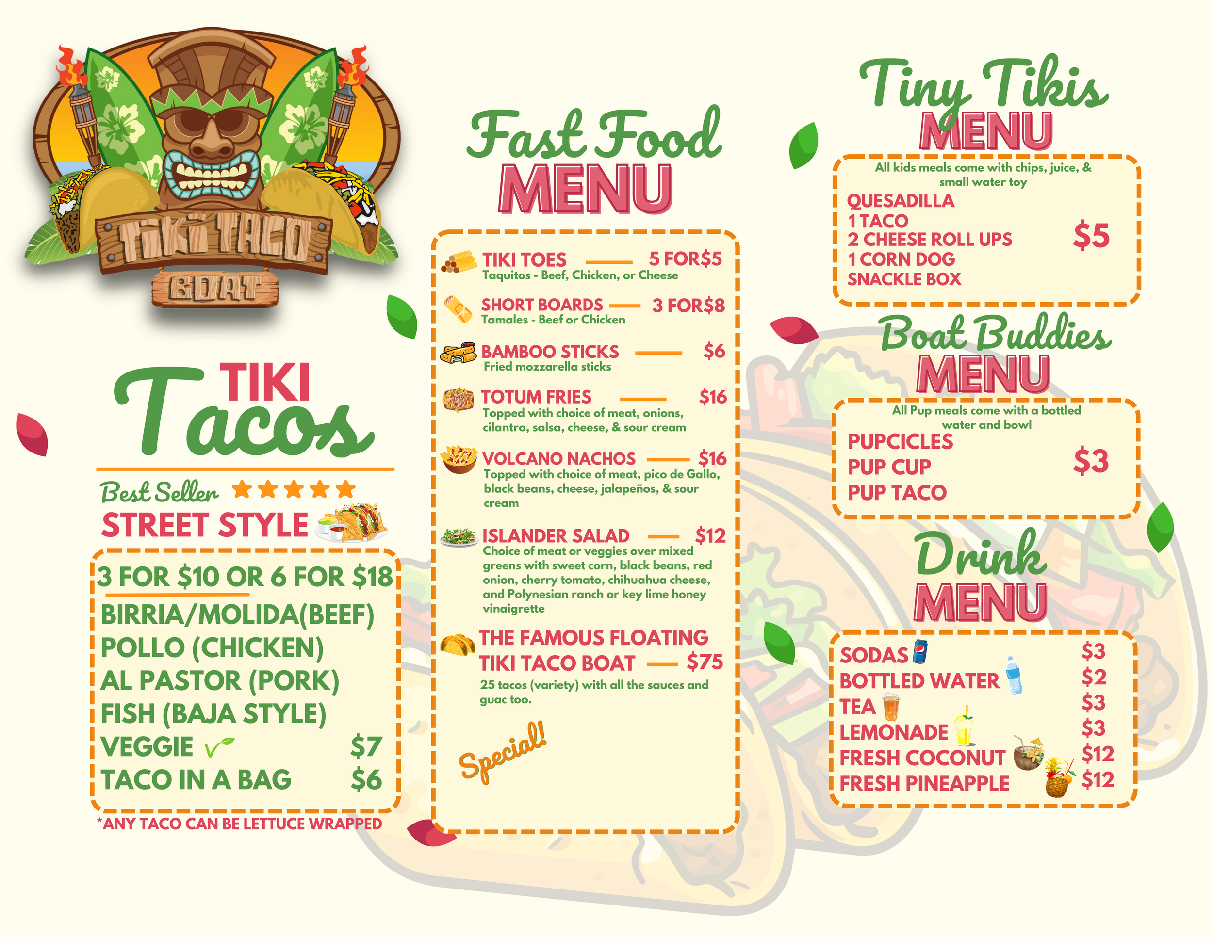 The Tiki Taco Boat prepares timeless recipes with your choice of locally sourced menu items.